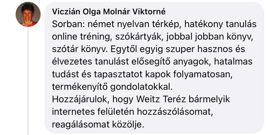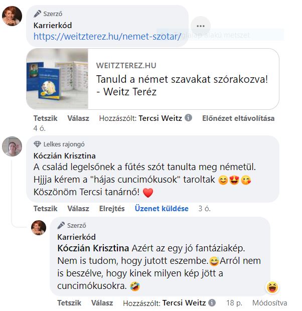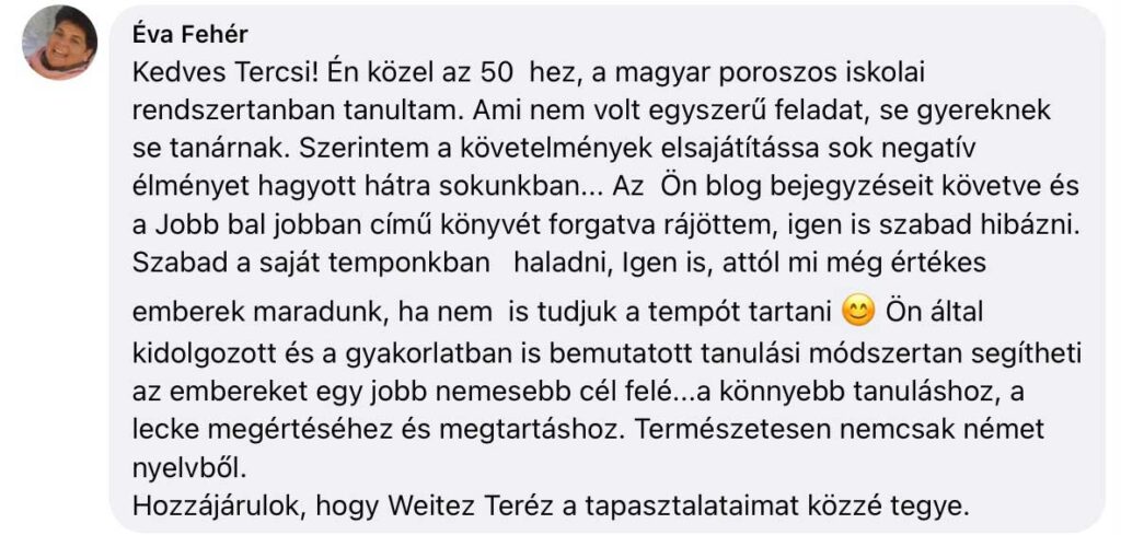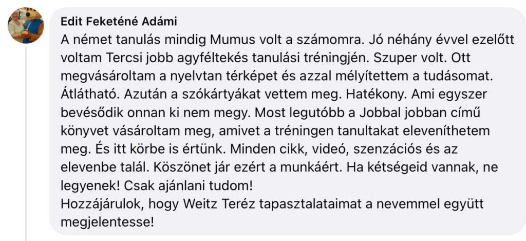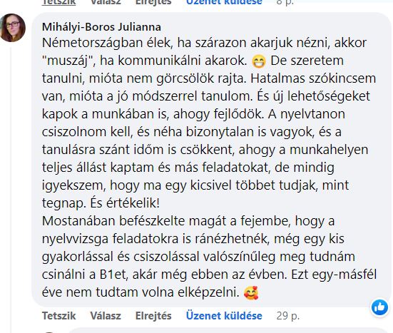 A tréning után bekerülsz egy Facebook csoportba, ahol további segítséget kaphatsz a csoporttagoktól és tőlem. Ötleteket arra, mit hogyan tanuljatok meg. Motivációt mások sikereiből.