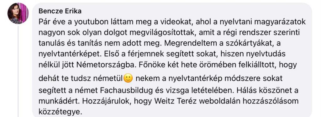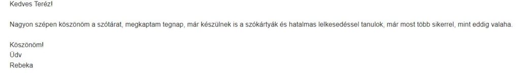 Egyre több diák jött hozzám németet tanulni, s a magán óraadásból nyelviskola született. Nyelvvizsgára készítettem fel a diákjaimat. A rettegett Rigó utcába jártunk, ha még emlékszel a hírére. Milyen eredményeket értünk el? Csoportosan vittem 14 éves diákokat vizsgázni. Mindig mindenkinek elsőre sikerült, igen magas pontszámmal. A folyosón csodánkra jártak a felnőtt vizsgázók. Nem értették, hogy hozzák a gyerekek 14 évesen ezt az eredményt. 15-16 évesen a diákjaim fele felsőfokúra is felkészült, hasonlóan kiemelkedő eredménnyel vizsgáztak. 26 évig készítettem fel diákokat közép és felsőfokú nyelvvizsgára.